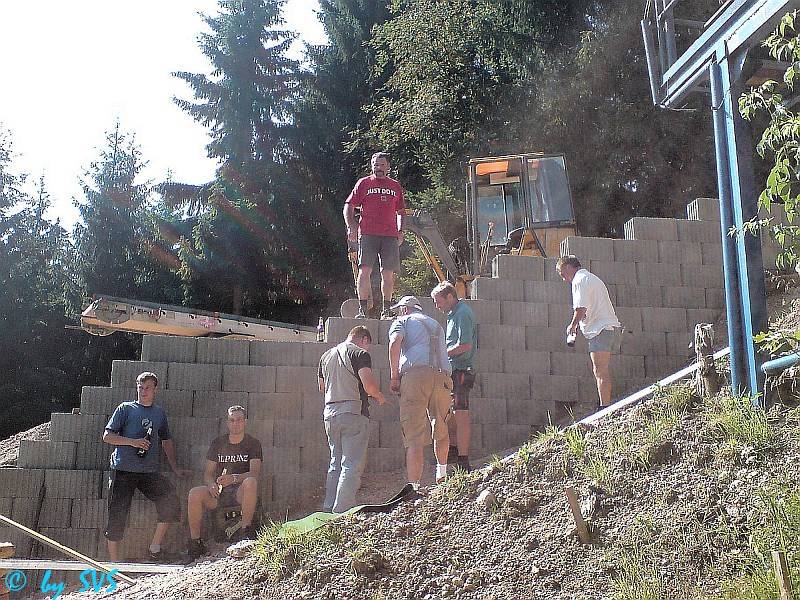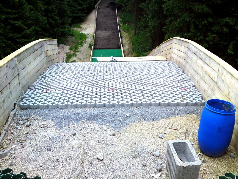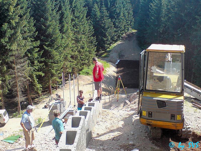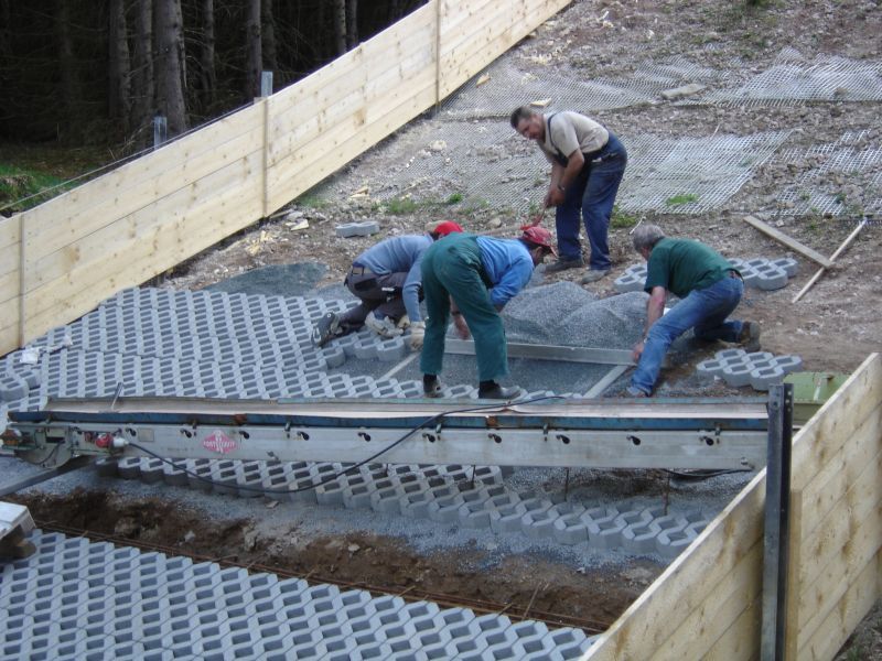 So sind wieder einmal Erdarbeiten für Hangbefestigung, Auslauf und Schanzenprofil notwendig. Weiterhin wurde bereits ein Schanzentisch gesetzt, und es wurde mit der Verlegung von Wabenplatten am Anlauf begonnen.