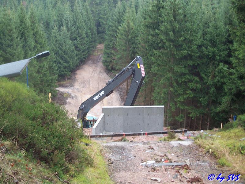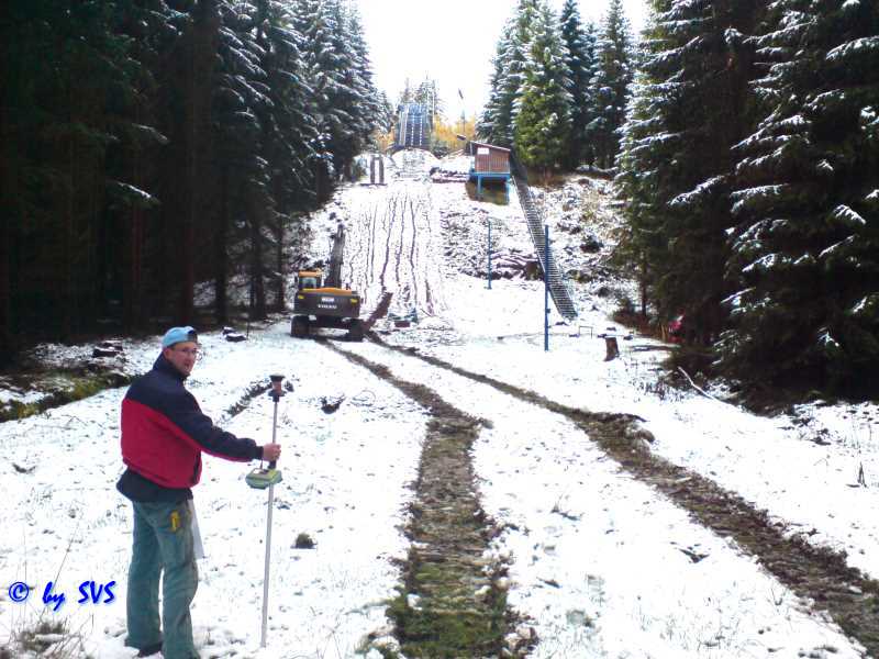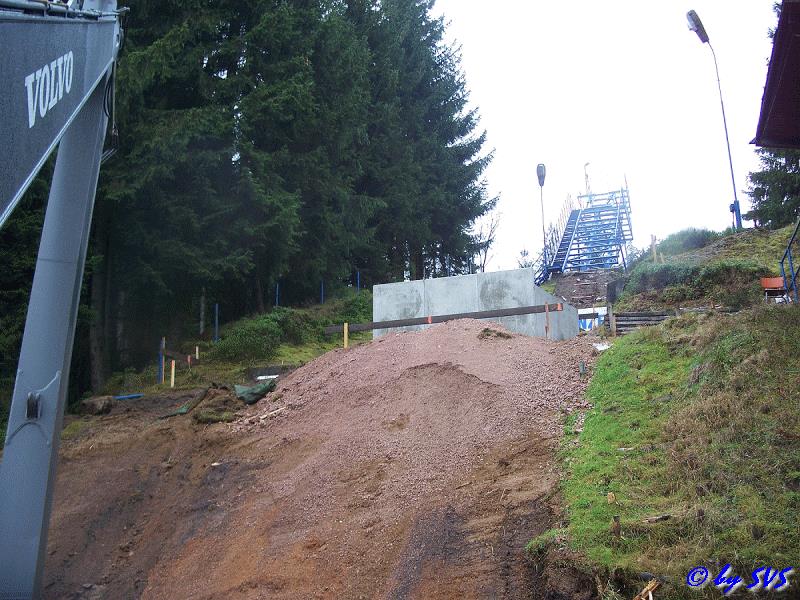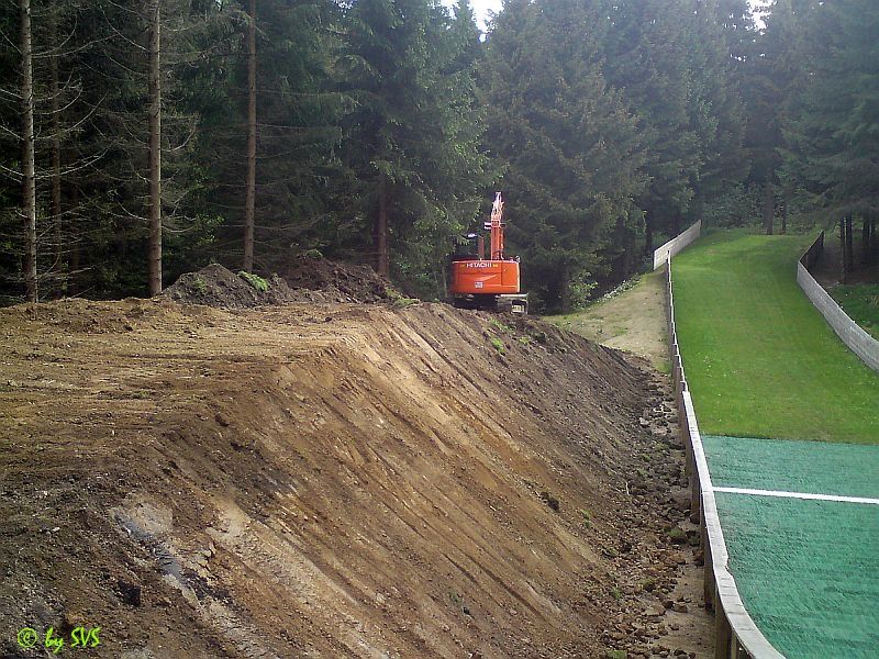 Erdarbeiten am Anlauf für die K8 Schanze durchgeführt. Für diese Schanze musste der vorhandene Treppenaufgang teilweise demontiert werden um diesen etwas zu verlegen. Es wurden bereits auch die für den neuen Treppenaufgang benötigten Fundamente betoniert.