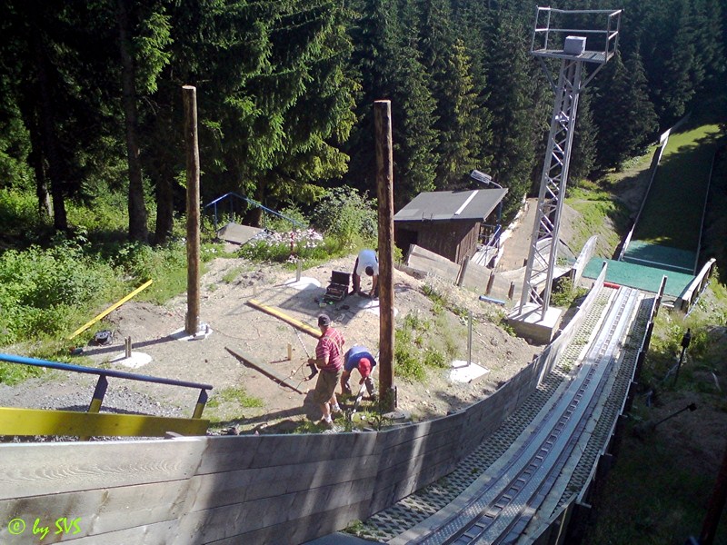 Die Arbeiten am An- und Auslauf der kleinsten Schanze wurden weiter fortgesetzt, so wurde der Auslauf mit Wabenplatten und Matten belegt und die