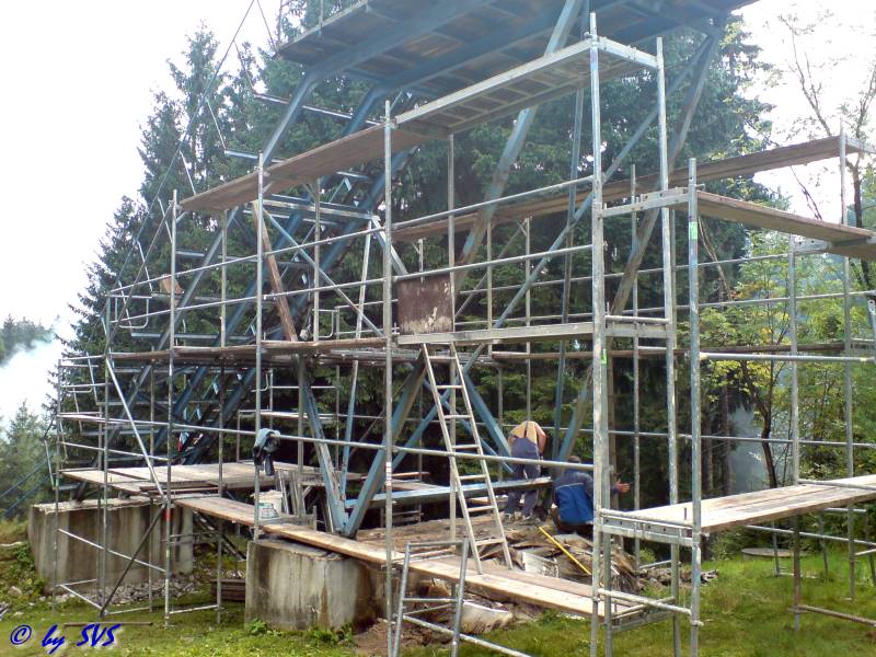 Zum Arbeitseinsatz am Wochenende wurden von den Fundamenten des Turmes eine aufbetonierte Schutzschicht abgepickert, und die Lager freigelegt. Im Bereich des Aufsprunghanges und Auslaufes mussten wegen den noch folgenden Erdarbeiten auch einige Bäume gefällt werden. Dank Technik und der Einsatzbereitschaft der Mitglieder und Freunde des SVS, konnte wieder einiges geschafft werden.
