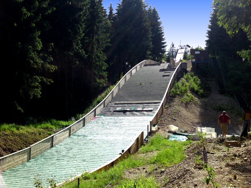 Im Juli und August wurde der Aufsprunghang komplett mit Matten belegt. Weiterhin wurde die Holzkonstruktion für die Turmerweiterung von der